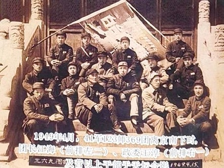 1949年4月,四十一军一二三师三六九团离京南下时,团长江海(前排左二)、政委王淳(前排右一)及营以上干部于天坛合影。