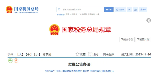 《欠税公告办法》,已经2025年11月11日国家税务总局第3次局务会议审议通过,现予公布,自2026年3月1日起施行。