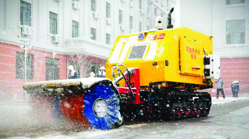 12月3日,威海智慧谷职业中等专业学校校园里,雪势较大。伴随着柴油发动机的轰鸣声,车身喷出一股热浪,身高1.8米的扫雪机器人“珊珊”稳稳启动,履带以每秒1米的速度向前推进。畅通的道路、师生的笑颜,还有“珊珊”忙碌的身影,构成了一幅动人的冬日校园画卷。
