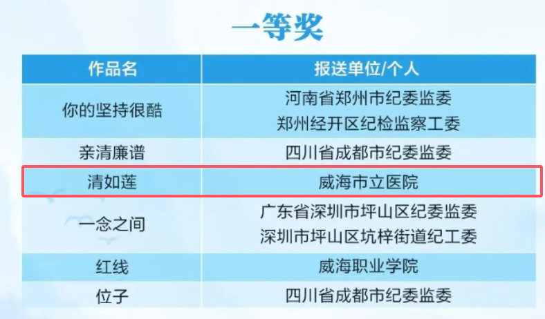 近日,首届“千里山海·清廉威海”廉洁文化作品创作大赛获奖名单正式公布,山东大学附属威海市立医院选送的廉洁文化作品凭借深刻的主题立意、精良的创作水准脱颖而出,一举斩获微电影类一等奖1项、公益广告类一等奖1项、公益广告类二等奖1项,用优秀作品为清廉医院建设添上靓丽一笔。