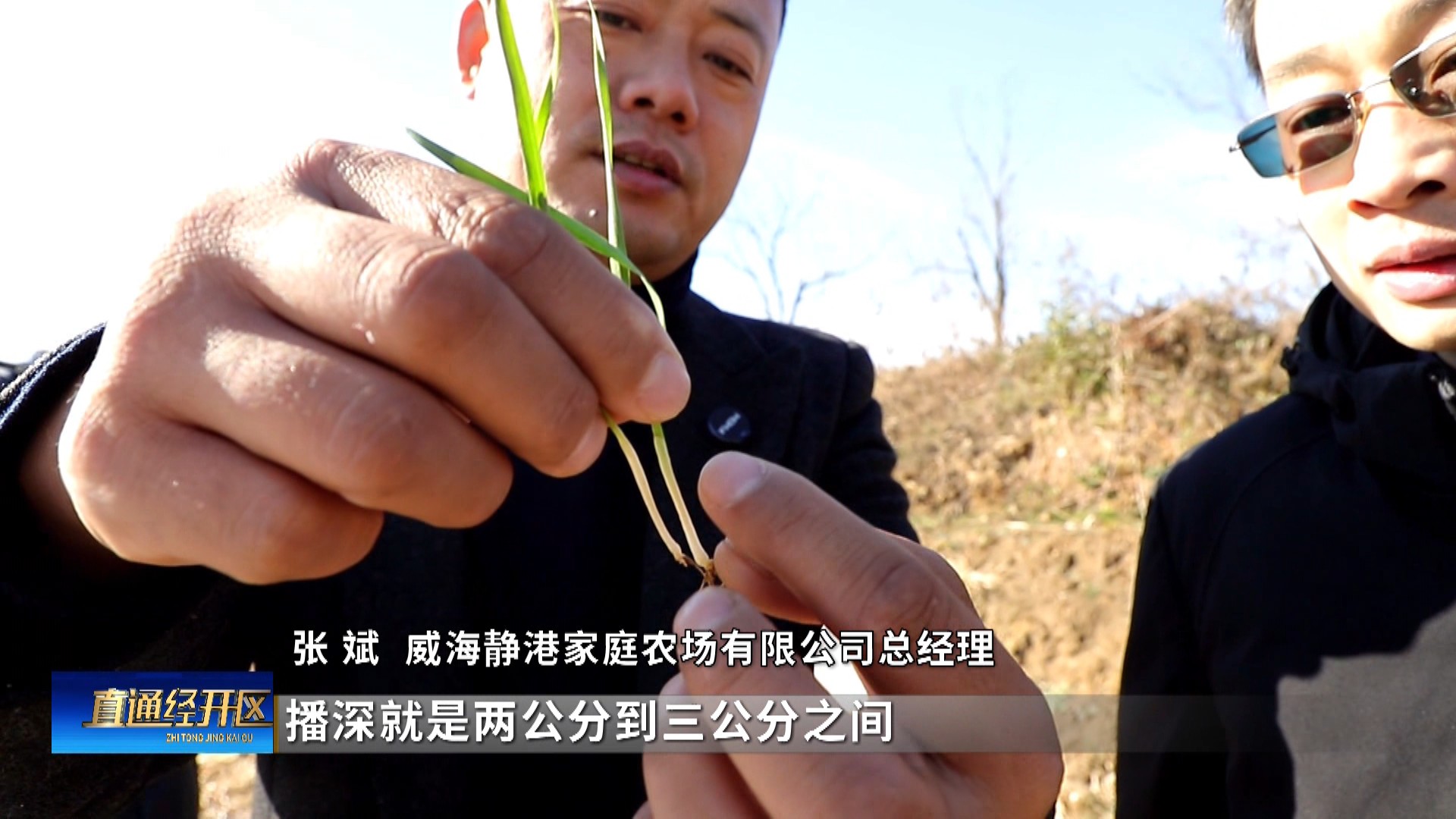 威海静港家庭农场有限公司总经理张斌说:“你看这个苗很壮,播深就是两公分到三公分之间,你看这苗就从白的地方能看出来,它播深都一致,然后苗很壮现在……”