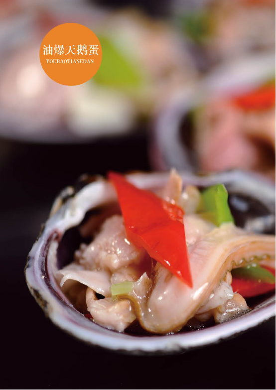 (3)将炒锅置旺火上烧热,倒入花生油,烧至4-5成热,倒入天鹅蛋片,迅速划散,捞