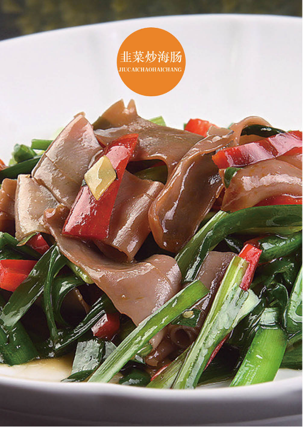 3.在烹调过程中,海肠焯水的温度应控制在85℃左右,焯水时间控制在3秒左右;大蒜用小火炒到刚刚断生没有蒜辣味即可;炒韭菜用急火快炒15秒左右即可。