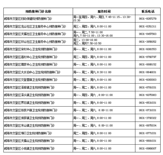 具体接种时间将依据预防接种门诊的服务时间及实际工作情况确定。关注“文登疾控中心”微信公众号或者查看下图查找就近的常规预防接种门诊电话和地址。
