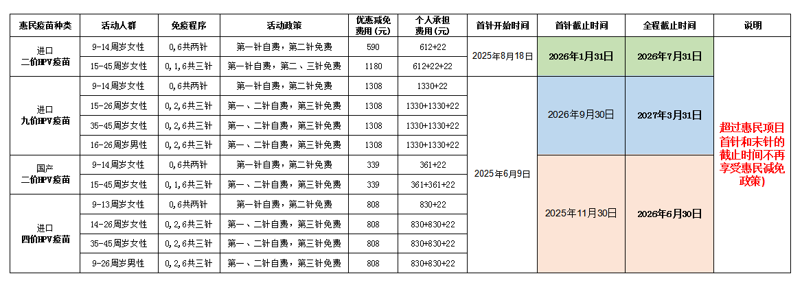 1.适龄人群若未在表中注明的时间前完成全程接种的或任一剂未在表中相应时间内接种的人员,不予享受本次减免优惠活动。