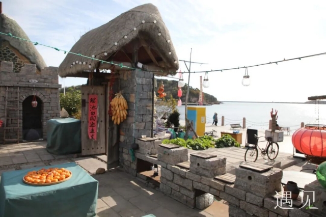 古朴的院落内,晾晒的地瓜、柿子与印有“胶东大院”“我在烟墩角很想你”等文字的布幔相得益彰;烟墩、酒坛、木梯、帆板、石墩、水缸等老物件与自然景致相融,渔家氛围感油然而生。