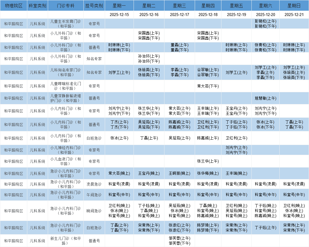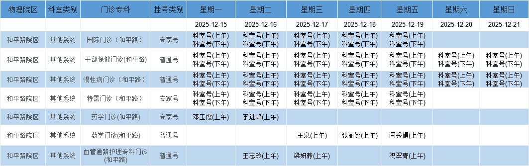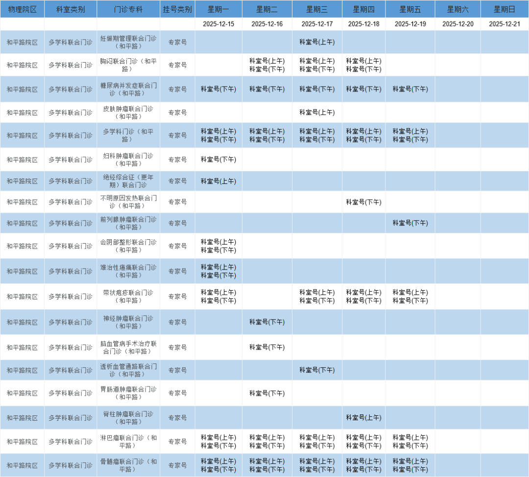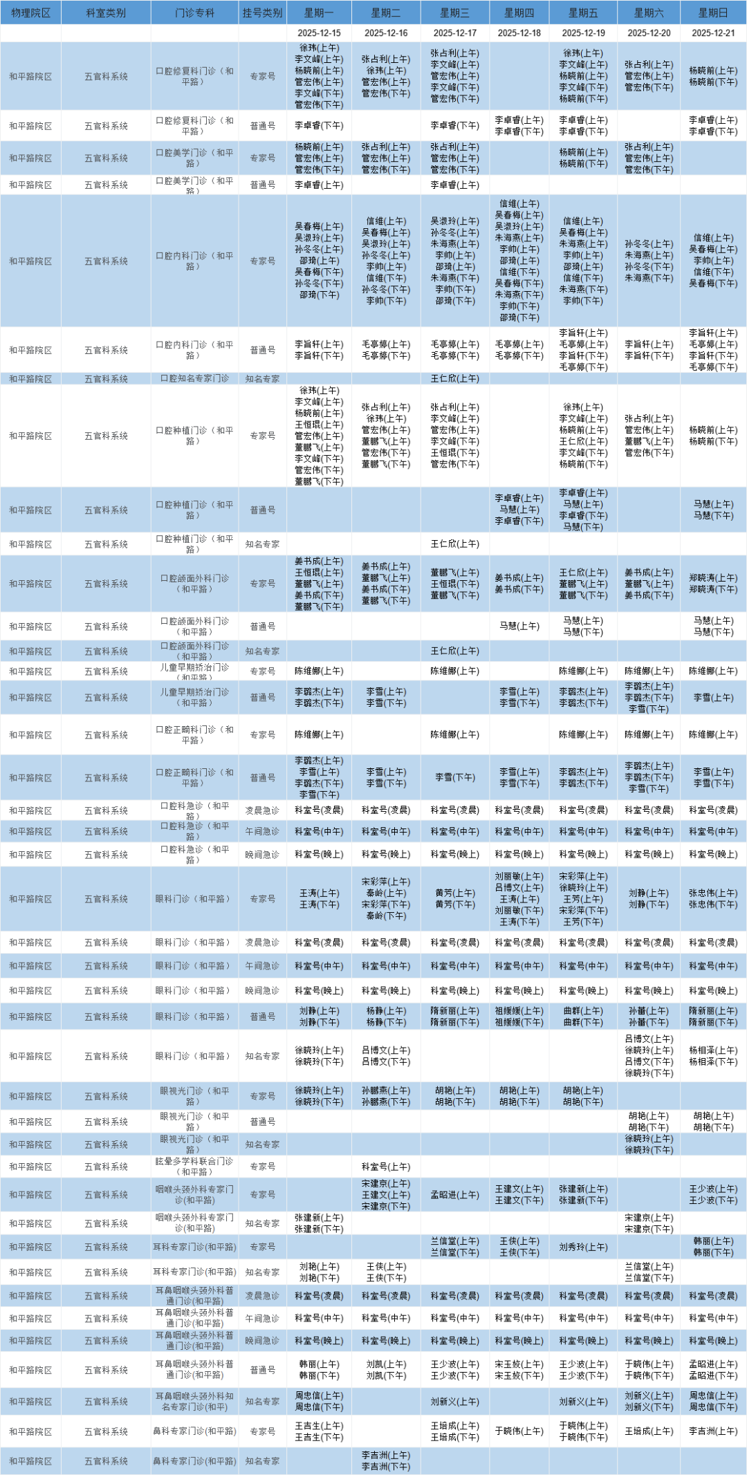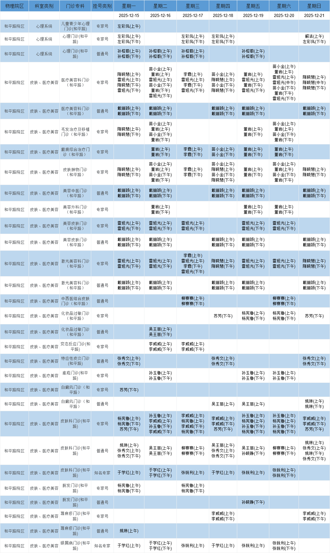 和平路院区心理、皮肤、医疗美容系统门诊排班表