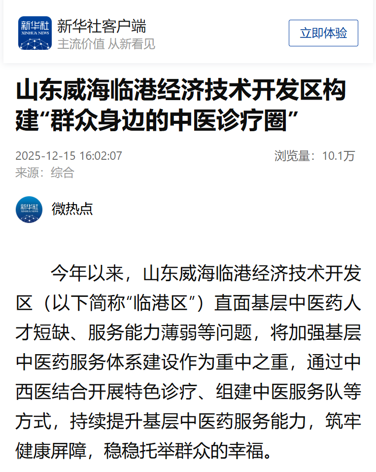 12月15日,新华社客户端以《山东威海临港经济技术开发区构建“群众身边的中医诊疗圈”》为题,聚焦威海市在提升基层中医药服务能力方面的经验做法,以下为报道全文: