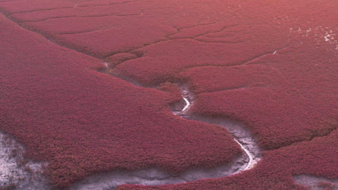 南海新区昌阳河入海口处,大片的红海滩舒展蔓延,以一抹热烈的嫣红勾勒出独特的生态画卷,成为独特的自然景观。红海滩的“主角”是耐盐碱的翅碱蓬。这些扎根滩涂的植物生命力顽强,簇拥生长成连绵的“红色海洋”,曾多次登上中央电视台。潮起潮落间,滩涂被冲刷出蜿蜒的纹理,宛如“大地之树”的根系舒展,与成片的翅碱蓬相映,形成“潮汐作画、红滩为墨”的奇景。微风拂过,红色草甸泛起涟漪,白鹭、苍鹭不时掠过水面,动静之间,恰似一幅浓墨重彩的夏日生态画卷。深秋时节,红海滩全面泛红,是观赏的最佳时候。