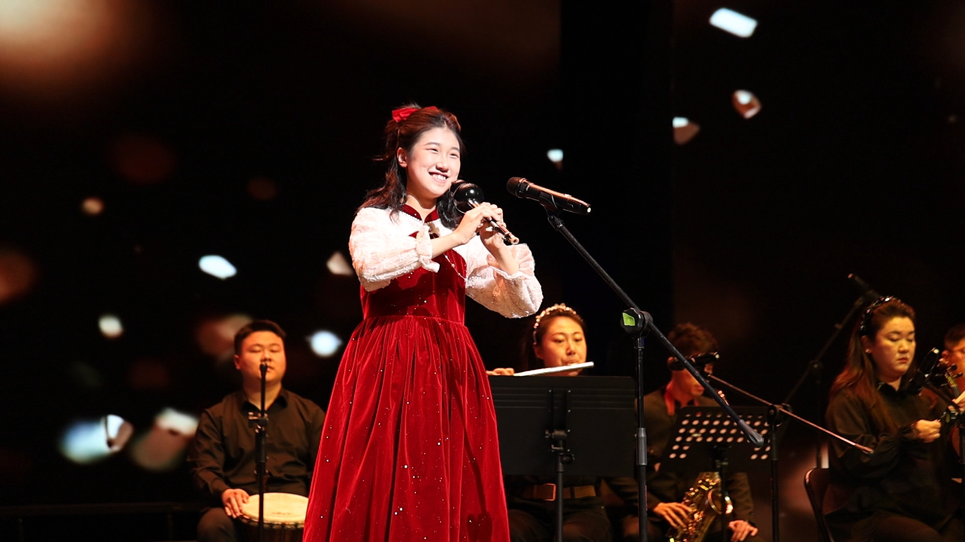 经过多次尝试,乐团老师们发现,打击乐声部稳定的节奏和明确的分工,能够让莜莜在保持自己节奏的同时感受到与集体的联结,因此她成为了打击乐部的一员。老师们也还记得,莜莜与音乐间也有着意义非凡的连接——葫芦丝。为了把那段旋律搬到舞台中央,老师们重新编曲:号声托起星光,弦乐悄悄铺成晚风——一首只为她存在的伴奏诞生了,莜莜站在聚光灯下,乐团的中外专家们化身片片绿叶,温柔地托起这朵初开的花。
