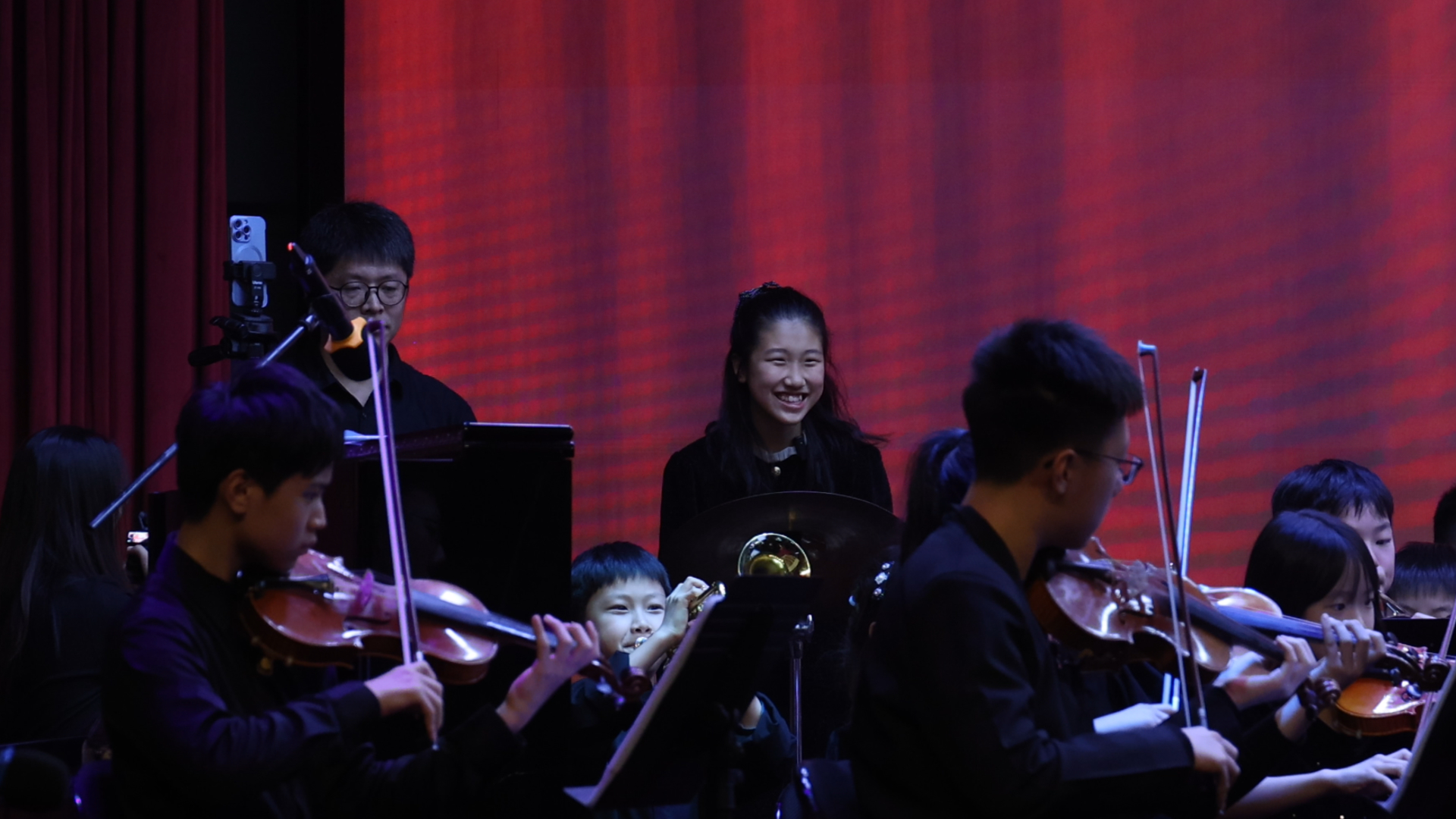 然而,正式演出中,每当她顺利完成演奏,老师总会在指挥间隙朝她竖起大拇指。莜莜便会立刻高兴地寻找妈妈的支持,妈妈也每次都回应以及时的鼓励。冷康康满手是汗,紧张而期待地守在侧幕旁,视线紧紧跟随着台上的女儿。莜莜每次望向后台,总能迎上妈妈鼓励的眼神和无声的口型:“加油。”为了尽可能保护莜莜,老师们精心安排了她的演出部分——节目相对独立,站位也靠近台侧,让她能在演奏后迅速退回这个安全的“港湾”;而当莜莜独奏时,妈妈便站进观众席、手中点亮一盏星星灯,成为她集中注意力的支点,也化作一份安然的陪伴。