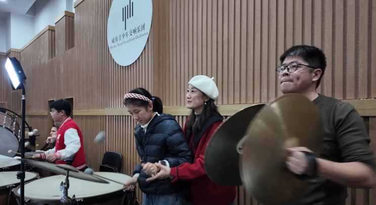 但对于莜莜而言,挑战远不只来自音乐技能本身,更是日复一日充满挑战的练习、逐步融入团队学习配合,正如她成长中学习的其他每一项技能。在两个多小时的乐团彩排中,为了让莜莜更好地参与,李团长特意安排她负责吊镲,她耐心地与莜莜约定:当她伸出两指,做出由下至上抬升滚奏的手势,她便击打吊镲、打出通往乐曲高潮的滚奏——那由弱渐强推起的声浪,是交响乐情绪的引爆点。这对于在注意力、对视和情绪管理上存在挑战的莜莜而言,是一项艰巨的任务。整个过程中,莜莜的妈妈冷康康始终充满爱意与耐心地站在她身后,轻声引导,帮她维持专注。
