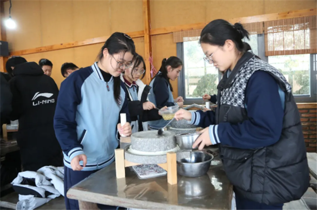 虽然正值冬季,但是这场研学活动还是让大家兴奋不已。现场同学们听得十分专注,他们两两分为一组,一人负责添加豆子和水,一人负责转动磨盘,渐渐地,乳白色的豆浆缓缓流出,豆香充斥着大家的鼻腔。随后,大家在老师的指导下往豆浆中添加卤水,静静等待豆浆逐渐凝固。不一会儿,原本液态的豆浆就变成了软嫩的豆花。