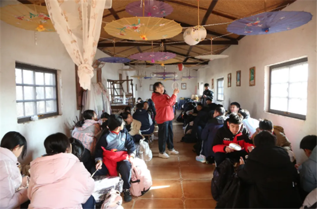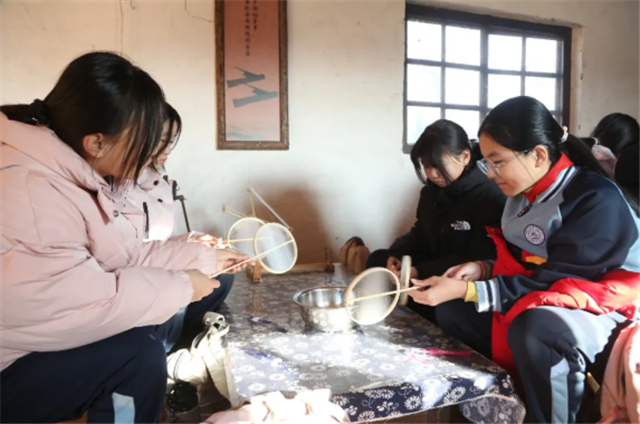在他们制作豆腐的同时,另一批学生正在桑麻演绎馆制作蚕丝扇。活动开始前,手工艺人为学生们介绍了蚕丝扇的历史渊源和制作工艺。随后大家将煮熟的蚕茧放入盆中,在老师的指导下,经过抽丝、绕丝、装饰等步骤,一把把精美的蚕丝扇就制作完成了。“以前只存在于课本上的蚕丝到我手里的时候,我感受到了中华优秀传统文化的博大精深,亲手做过才能体会到古时制作精美丝绸匠人的不易。”学生于雅萱说。