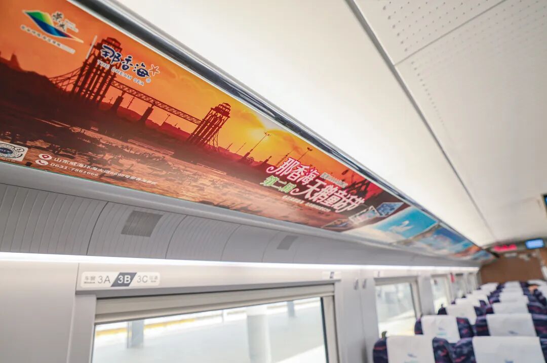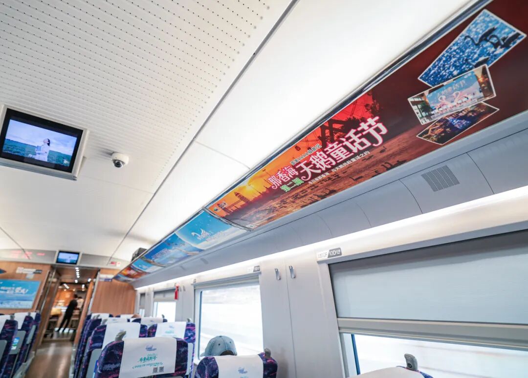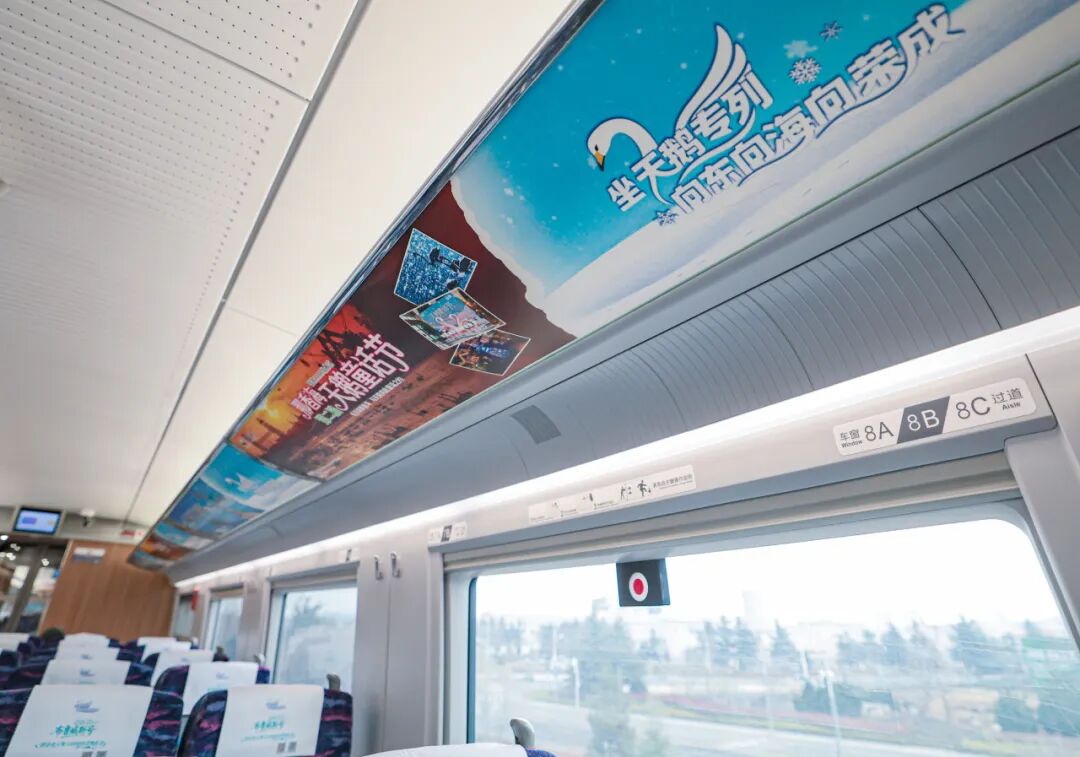 “天鹅旅游专线列车”自河南信阳始发,经停郑州,抵达荣成。为提升游客沉浸式体验,专列精心营造全链条主题氛围,从车厢内部的观鹅指南、主题标识,到高铁站内的主题展板、宣传长廊,全方位彰显“荣成天鹅季”品牌形象。