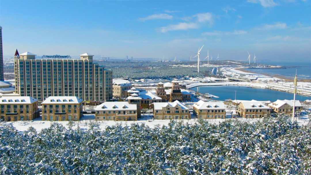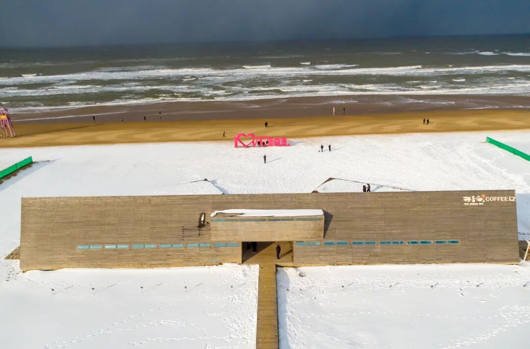 山海雪画卷:雪后的钻石沙滩浴场、黑松林、守望者二号咖啡厅,共同构成一幅静谧而壮阔的北国滨海雪景图。