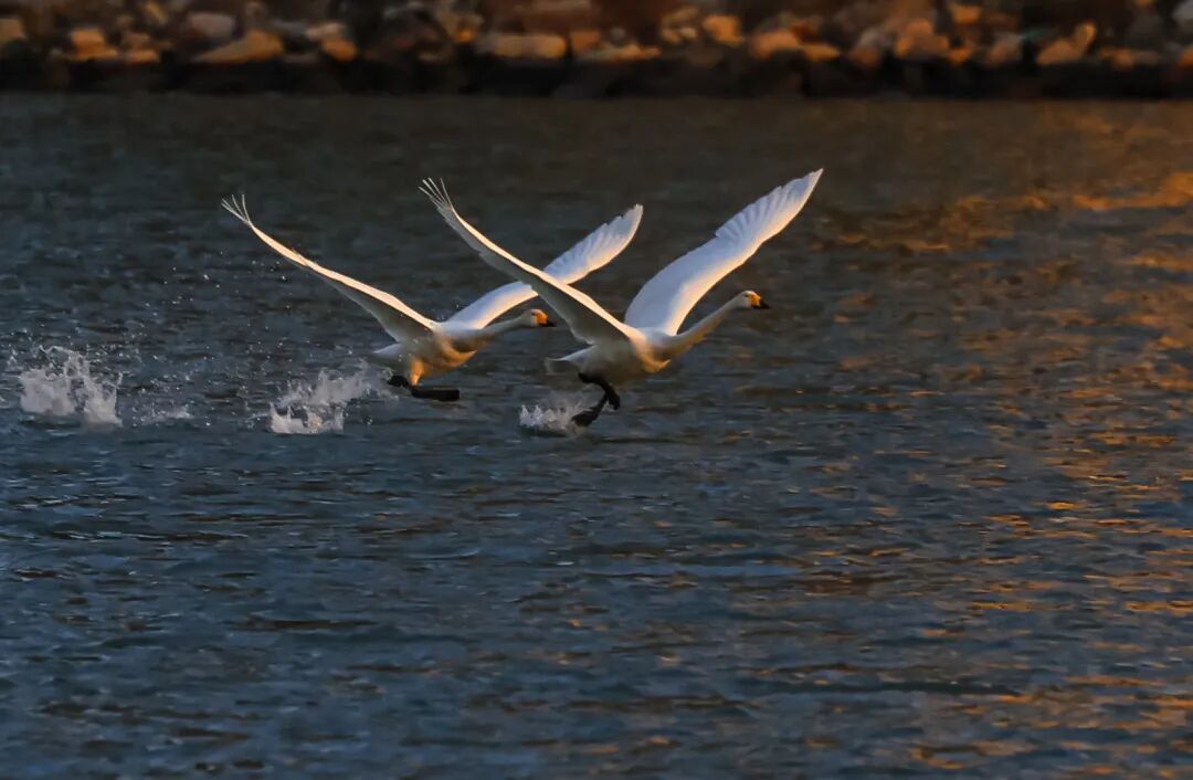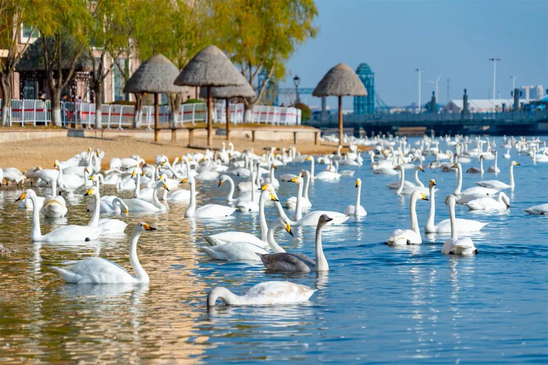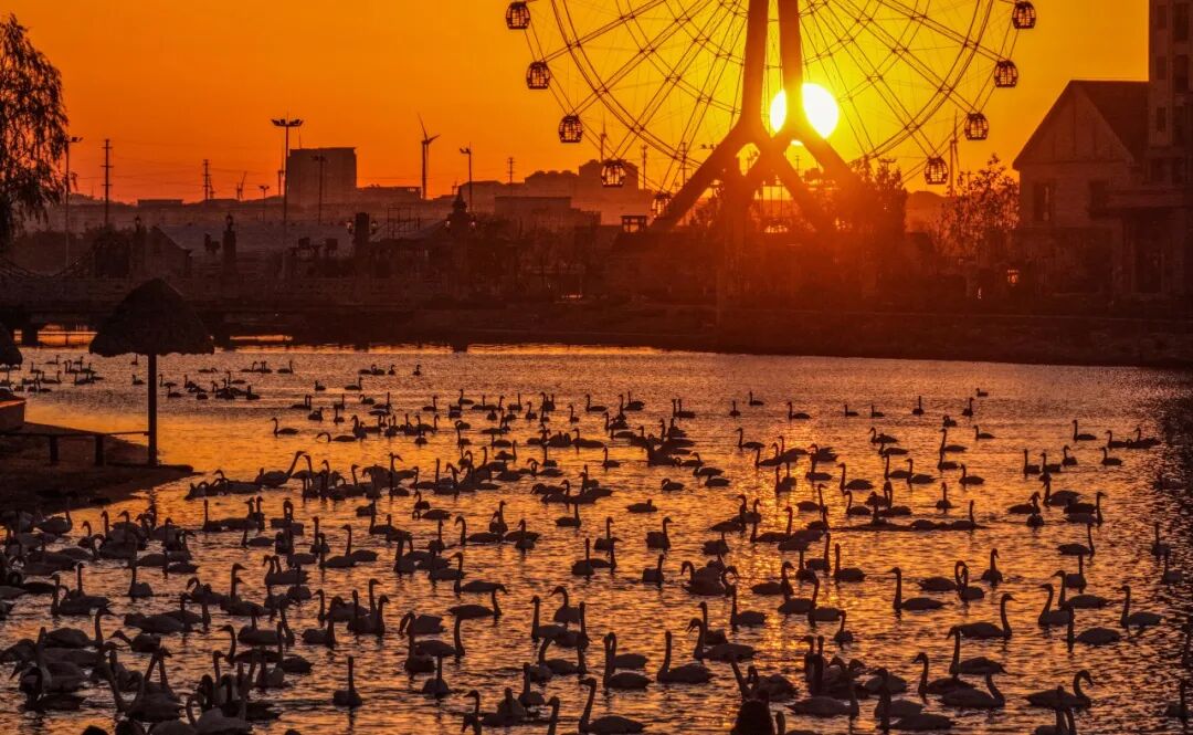 与天鹅共舞:主角是1500余只来自西伯利亚的大天鹅。最佳观赏点在天鹅湖沿岸及摩天轮,清晨时分,光线柔和,天鹅活跃,最出片。