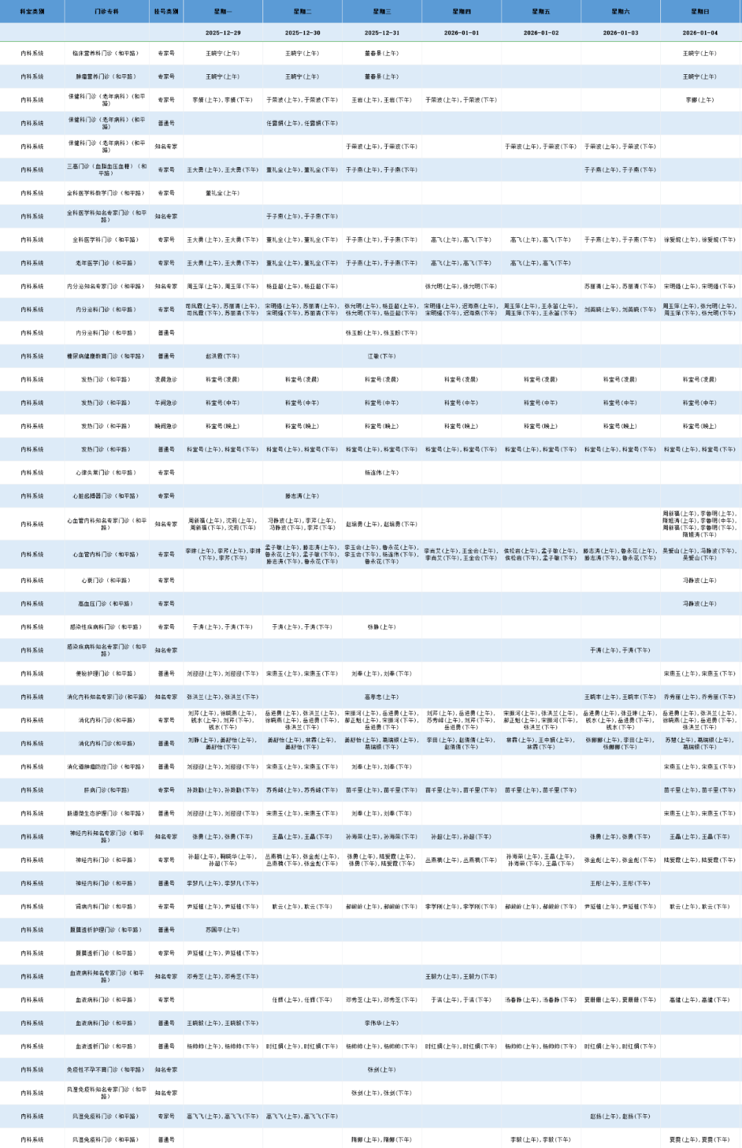 和平路院区内科系统门诊排班表