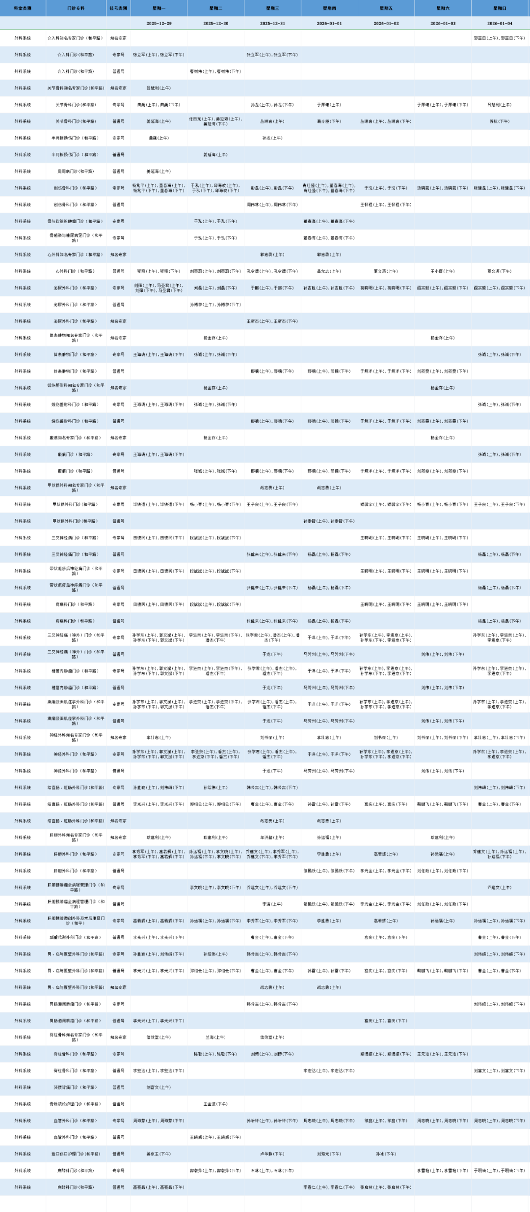 和平路院区外科系统门诊排班表