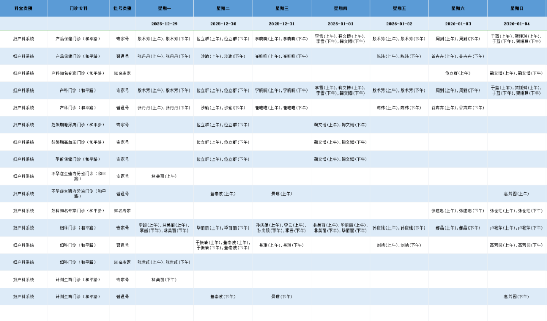 和平路院区妇产科系统门诊排班表