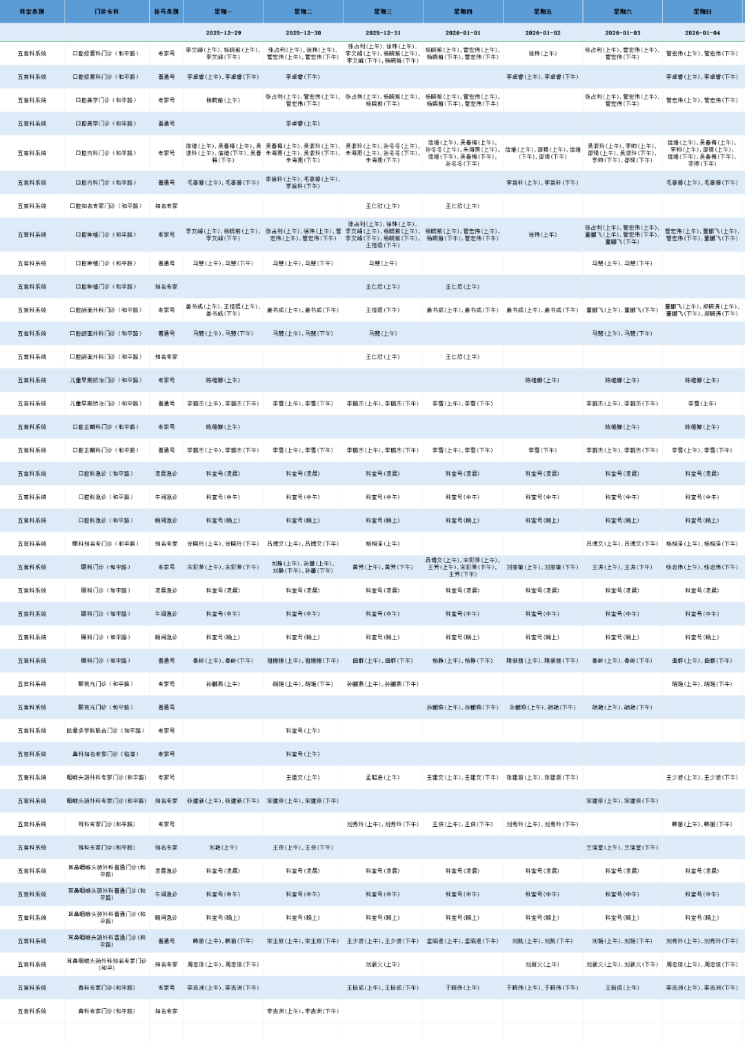 和平路院区五官系统门诊排班表