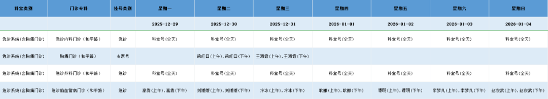 和平路院区急诊系统门诊排班表