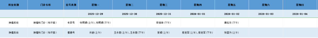 和平路院区肿瘤系统门诊排班表