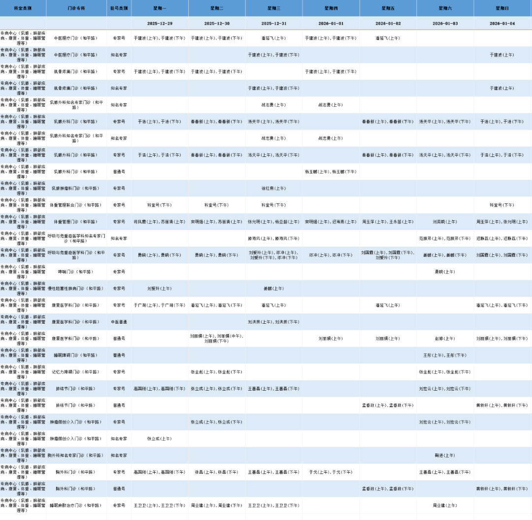 和平路院区专病中心门诊排班表