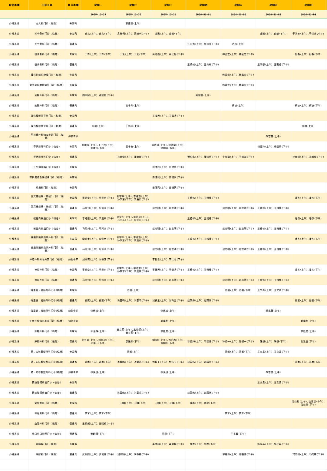 临港院区外科门诊排班表