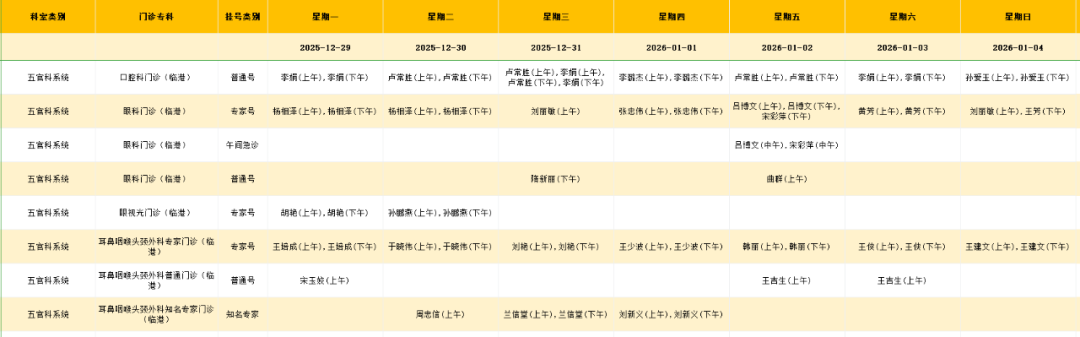 临港院区五官系统门诊排班表