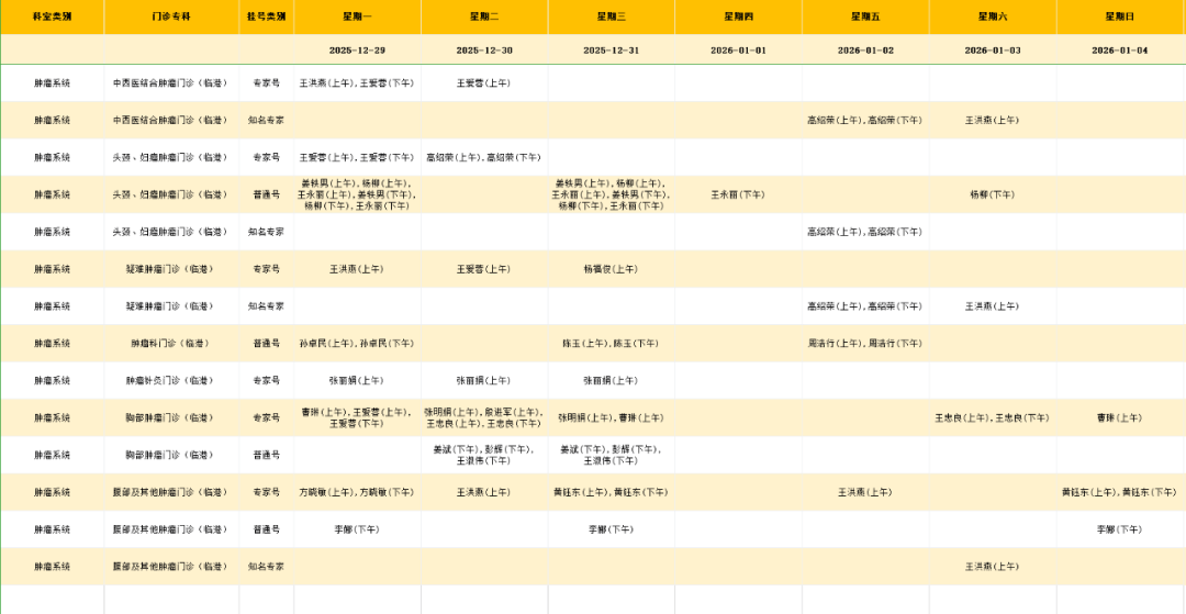 临港院区肿瘤系统门诊排班表