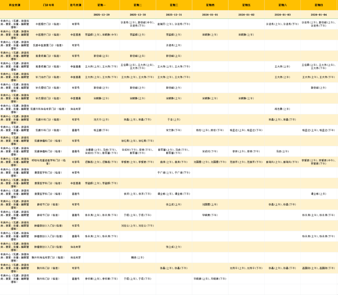 临港院区内科门诊排班表