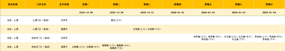 临港院区皮肤、心理门诊排班表
