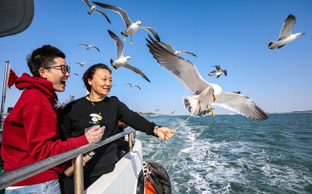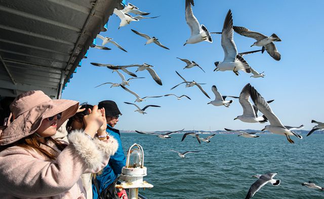 冬季来威海,一定要体验海边喂海鸥的乐趣!手执面包或火腿,看海鸥翩跹飞舞、掠雪逐浪,定格一幅灵动浪漫的冬日海景。