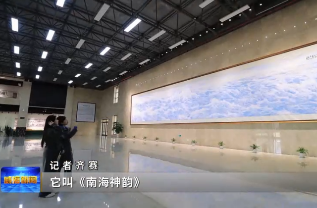 刘人岛艺术馆办公室副主任郭云燕说,它的长是21米,高是3.28米,一个巨幅作品。值得说的是,刘人岛老师画的所有海,它的白颜色都是自然留白出来的。