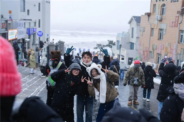 除了这些“有备而来”的游客,不少人还收获了意外之喜。来自广东的邹琳琳原本计划昨天就结束旅行,踏上返程的列车,前一晚听说今日有雪,她当即决定改签,延迟行程。“活了30多年,这是我第一次见这么大的雪!”站在幸福门广场上,邹琳琳仰头望着漫天飞舞的雪花,忍不住感叹“威海真的好靓哦!”她特意将威海的最后一站定在幸福门,不仅看了雪后海滨的景色,还体验了喂海鸥的乐趣,洁白的海鸥在雪中盘旋,被她永远定格在相机里。