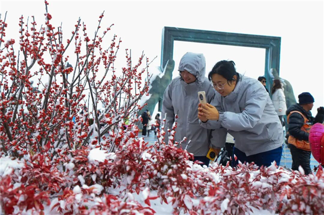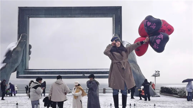 在威海公园的大相框前,记者随机采访几位游客,得到的答案一个比一个“有距离感”。这些远道而来的客人,早早就盯着天气预报做足了功课,把“威海看雪”列入了冬日旅行的必打卡清单。“出发前天天刷天气,生怕雪下小了或者提前停了,现在看来,真的不虚此行!”来自浙江的游客于庆男和朋友刚下高铁,手里还拎着行李箱,就直奔大相框而来。