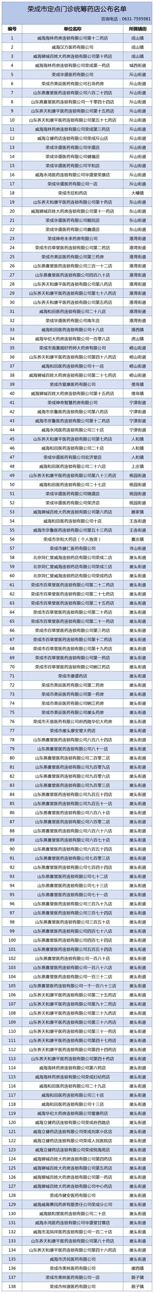 138家药店为荣成市定点门诊统筹药店,名单如下: