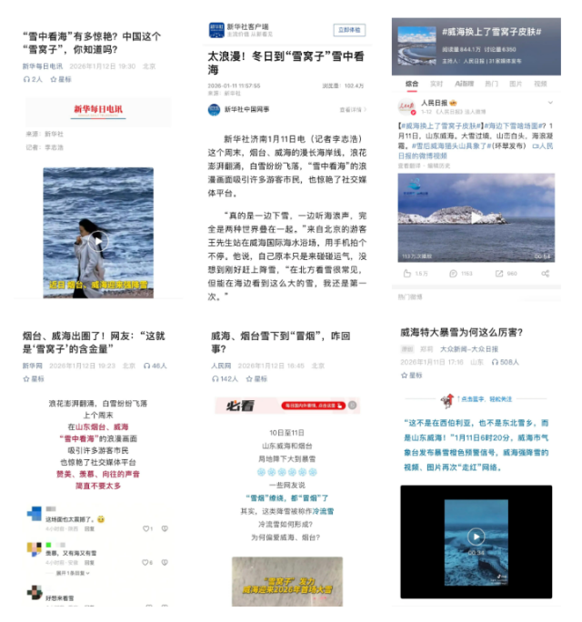 新华每日电讯、人民网、新华网、中新社、大众日报等国家级、省级主流媒体刊发主题报道十余篇,其中,人民日报微博#威海换上了雪窝子皮肤#单条阅读量超2000万,新华社客户端刊发《太浪漫!冬日到“雪窝子”雪中看海》单篇阅读量破百万。