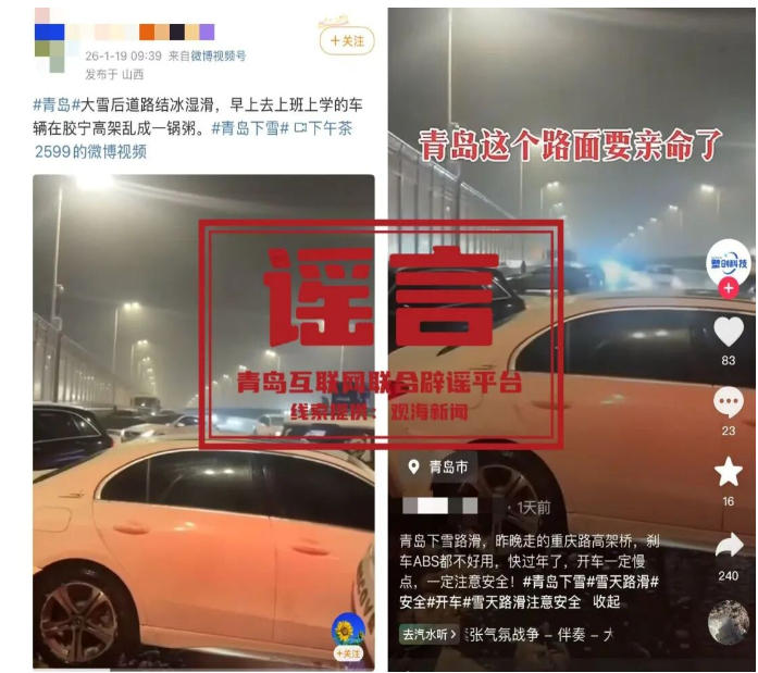 1月19日,有网民在微博平台发帖称“青岛大雪后道路结冰湿滑,早上去上班上学的车辆在胶宁高架乱成一锅粥”;还有网民发布视频称“青岛下雪路滑,昨晚走的重庆路高架桥,刹车ABS都不好用”,所配视频相同,皆为多车连环追尾事故画面。