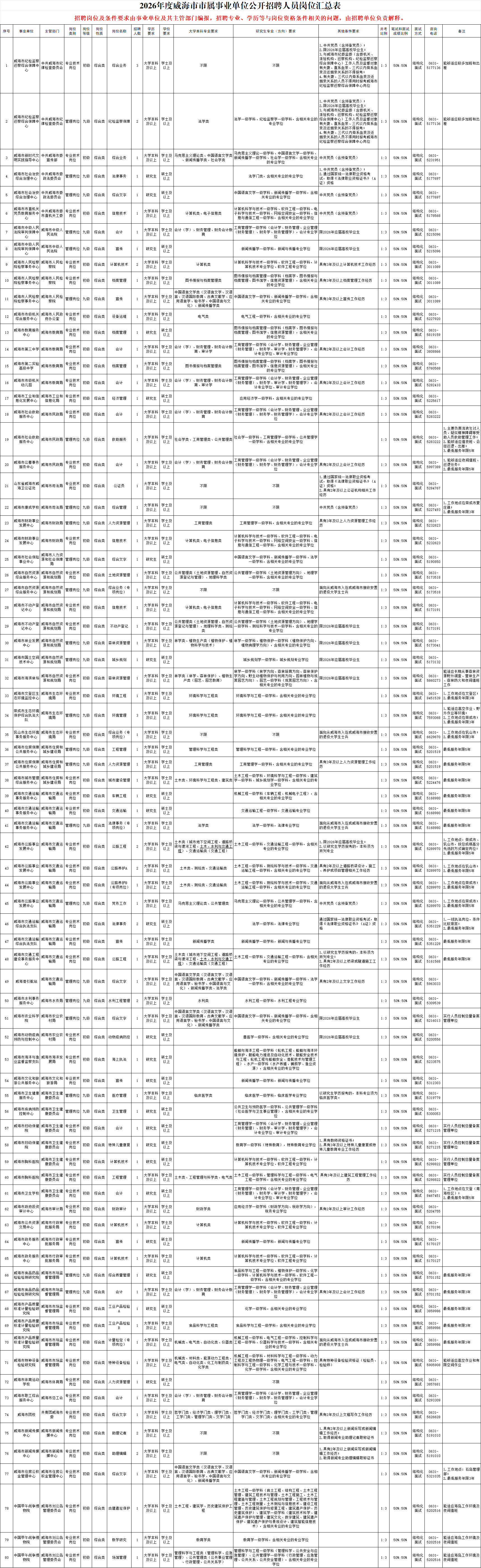 市属事业单位初级综合类岗位公开招聘人员的岗位条件、招聘人数等具体要求由招聘单位及其主管部门根据行业特点和单位实际制定,详见《2026年度威海市市属事业单位公开招聘人员岗位汇总表》(以下简称《岗位汇总表》)。应聘人员所学专业、取得资格、从事工作经历等是否符合招聘岗位要求,由招聘单位及其主管部门认定。
