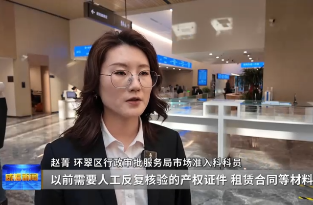 环翠区行政审批服务局市场准入科科员赵菁表示,以前需要人工反复核验的产权证件、租赁合同等材料,现在系统自动匹配核验标准地址,通过全程电子化办理,免于提交产权证明即可办理,审批效率提升50%以上。