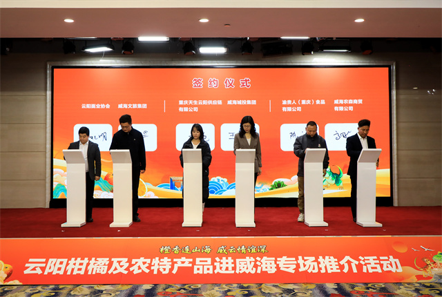 签约仪式上,云阳县多家企业及协会分别与威海相关企业达成柑橘及农产品销售合作协议,为两地产销对接奠定坚实基础。随后,两地相关部门及单位负责人共同按下启动手印,标志着威云“山海相连、产销相通”的合作之路全面开启。未来,云阳将以最优营商环境保障合作共赢,威海将持续发挥渠道优势助力云阳农产走向更广阔市场。威云两地将以此次活动为起点,深化鲁渝协作,让山海情谊在合作中愈发深厚,共同书写互利共赢的新篇章。(Hi威海客户端记者 董传葆/文 姚威/图)