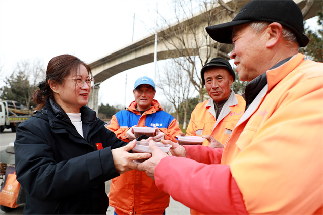 志愿者将腊八粥免费送给环卫工人。