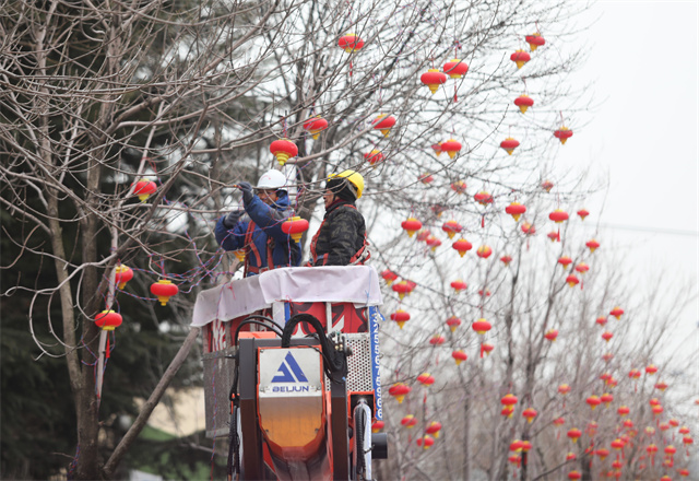 当天,在市区人民广场,园林工人正在安装节日彩灯,营造节日氛围;在文化中路,施工人员将一串串喜庆的彩灯悬挂在道路两侧的树枝上,灯笼高挂,年味渐浓。
