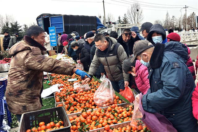 在羊亭大集上,居民选购水果。