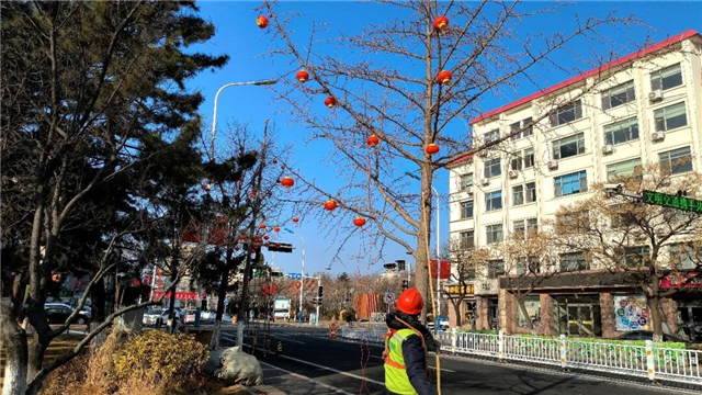 今年,彩灯布置增添了新意。除了在七条主干道上延续经典的灯笼与灯串组合,环翠区市政园林服务中心还特别引入了蕴含美好寓意的造型灯饰——枝头新挂的柿子灯、苹果灯以及“福”字灯笼,不仅丰富了视觉的层次与色彩,更寄托了“事事如意”“平安喜乐”的新春祝福,与浓厚的传统节庆氛围相得益彰。