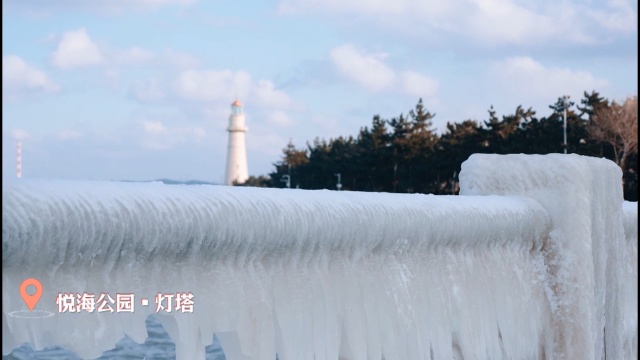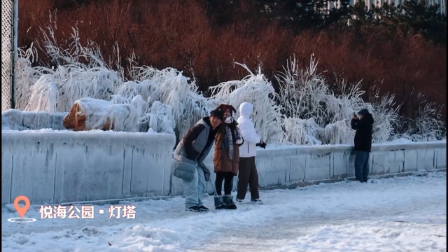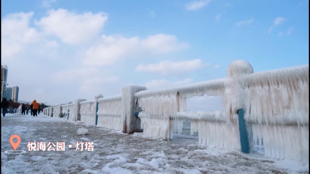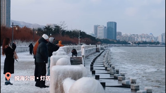 在经区悦海公园,凛冽的寒风中,海鸥盘旋,波涛翻涌,连片的冰凌,勾勒出震撼的冰凌奇观。