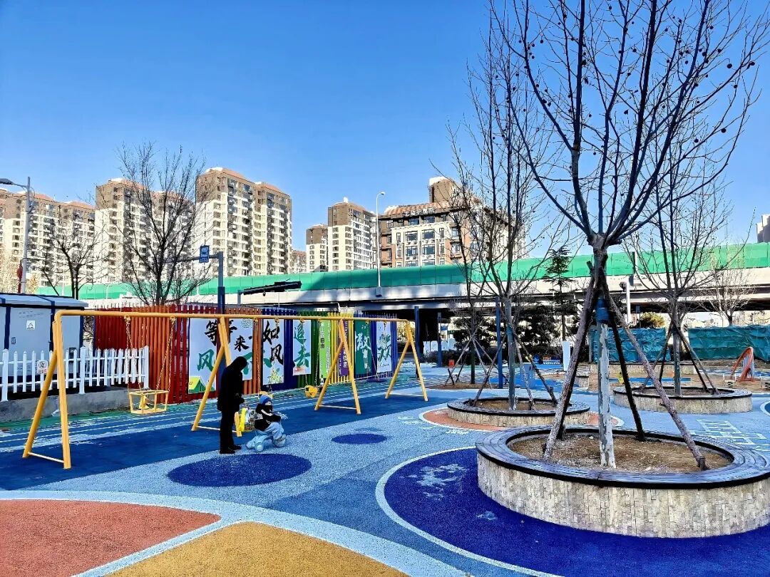 公园内各类设施布局合理、色彩明快。其中,趣味篮球场以黄、橙、蓝三色拼接出活泼的运动地面,搭配童趣十足的黄色弧形篮球架,成为孩子们和年轻人挥洒汗水的欢乐场;一旁的秋千活动区由鲜亮的黄色支架组成,一位家长正陪着孩子在秋千旁玩耍,暖阳下满是温馨。