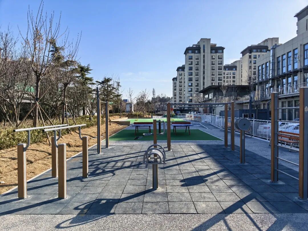 除了完善的运动设施,悦和园更注重生态感与舒适度的提升:圆形树池里栽植法桐,夏季为游园群众提供遮荫空间,同时树池边缘兼具坐凳功能,居民运动累了就能随时坐下休憩;透水铺装的甬路蜿蜒贯通全园,衔接外部交通,方便居民进出;景观灯的安装让园区夜晚也亮堂起来,不少居民晚饭后走出家门健身运动,幸福感满满。